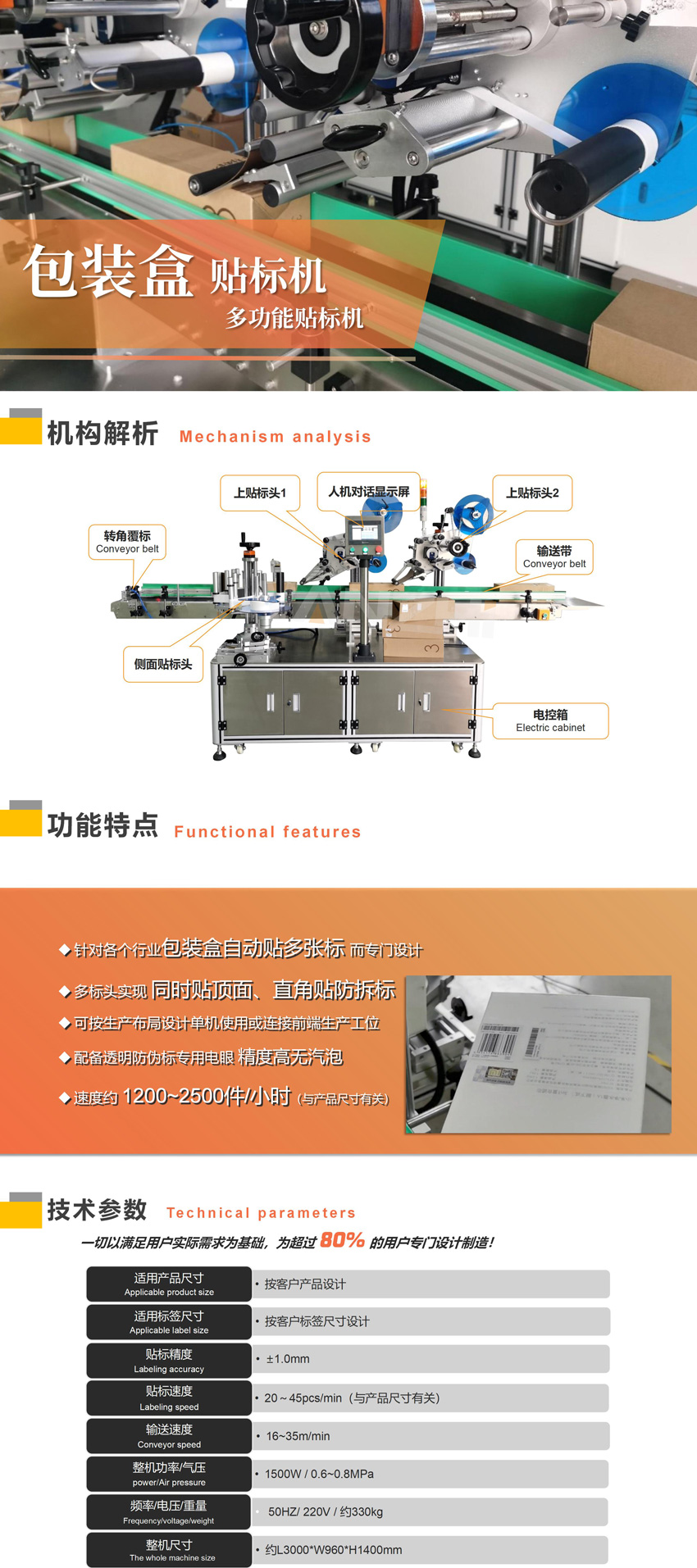 適用于在各種包裝盒的上平面+轉(zhuǎn)角+側(cè)面貼標(biāo)簽或不干膠膜,實(shí)現(xiàn)多功能貼標(biāo)一體化,本案例為濾芯器包裝盒貼標(biāo)專屬訂制。