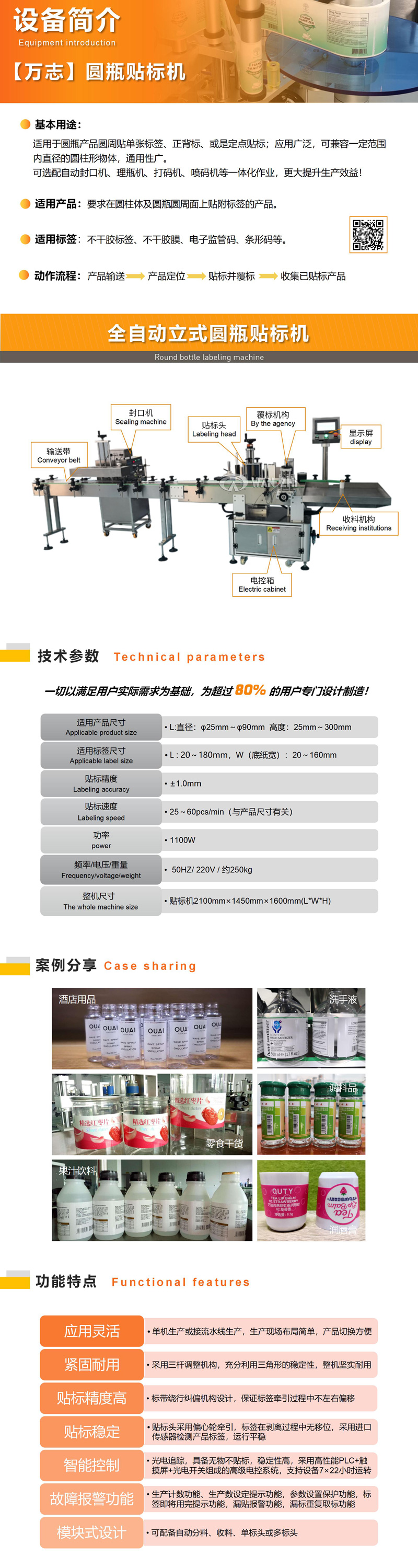 全自動圓瓶貼標機適用于在圓瓶類物體圓周面貼標簽,可貼單標和雙標,正背雙標間距可靈活調(diào)整,如zheli喱水圓瓶、食品圓罐等貼標,廣泛應(yīng)用于化妝品、食品、醫(yī)藥、消毒水等行業(yè)。選配圓周定位檢測裝置,可實現(xiàn)在圓周面指定位置貼標。可根據(jù)需求選配色帶打碼機、噴碼機和封口機等;