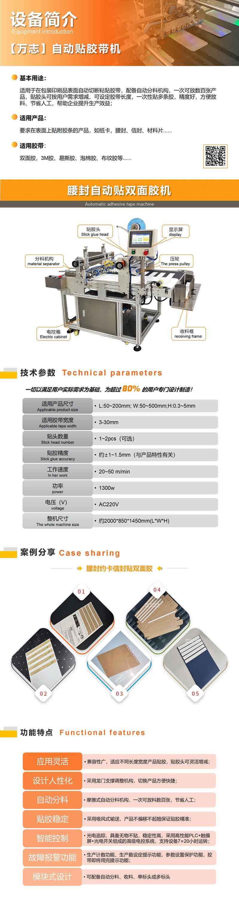 適用于在包裝印刷品表面自動切斷粘貼膠帶,配置備自動分料機(jī)構(gòu),一次可放數(shù)百張產(chǎn)品,貼膠頭可按用戶需求增減,可設(shè)定膠帶長度,一次性貼多條膠,精度好,方便放料、節(jié)省人工,幫助企業(yè)提升生產(chǎn) 益;