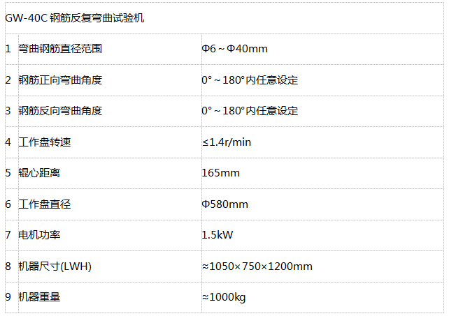 GW-40C鋼筋反復彎曲試驗機對鋼筋等金屬材料進行正向180°彎曲試驗、反向180°彎曲試驗,觀測試件是否產生裂紋,判斷鋼筋等金屬材料在彎曲塑性變形與時效后的反向彎曲變形性能。