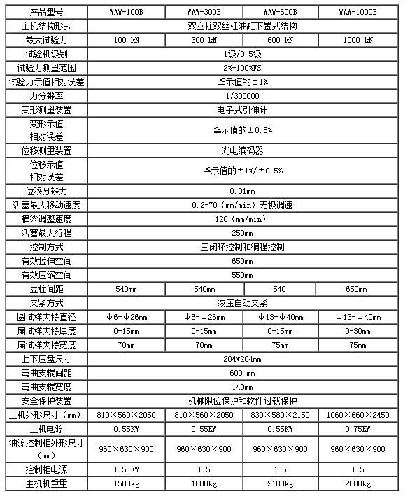 WAW-B系列微機(jī)控制電液伺服萬能試驗(yàn)機(jī)由雙立柱雙絲杠油缸下置式主機(jī)及琴式油源控制柜組成,油泵采用意大利馬祖奇進(jìn)口低噪音高性能齒輪泵。拉伸空間位于主機(jī)上方,壓縮、彎曲試驗(yàn)位于主機(jī)下方即中橫梁和工作臺之間。試驗(yàn)空間的調(diào)整通過移動中橫梁來實(shí)現(xiàn),中橫梁升降采用鏈條傳動。計(jì)算機(jī)全自動閉環(huán)控制高性能電液比例伺服閥來完成對各種材料的拉伸、壓縮、彎曲等試驗(yàn)。試驗(yàn)完成以后自動采取材料的FM、REH、REL、RPO.2、RP1、RM和彈性模量E等實(shí)驗(yàn)結(jié)果。